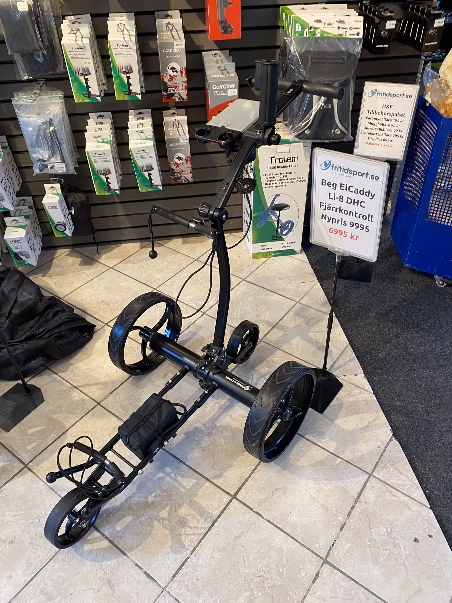 ElCaddy Remote från H&F, en elgolfvagn komplett med finesser som underlättar tiden på golfbanan och gör spelet mer njutbart. Med DHC, fjärrkontroll och broms. Det här är en stabil vagn i aluminium som är enkel att fälla ihop. Med DHC-motorbroms och fjärrkontroll kan du enkelt manövrera vagnen runt golfbanan. Löstagbart batteri för enkel transport och laddning.