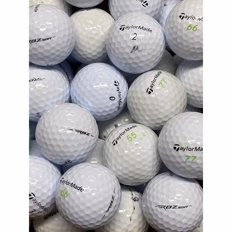En mix som innehåller olika varianter av TaylorMade Rocketballz. Begagnade golfbollar bärgade från vattenhinder. Reklamlogotyper, tuschmarkeringar, vissa missfä