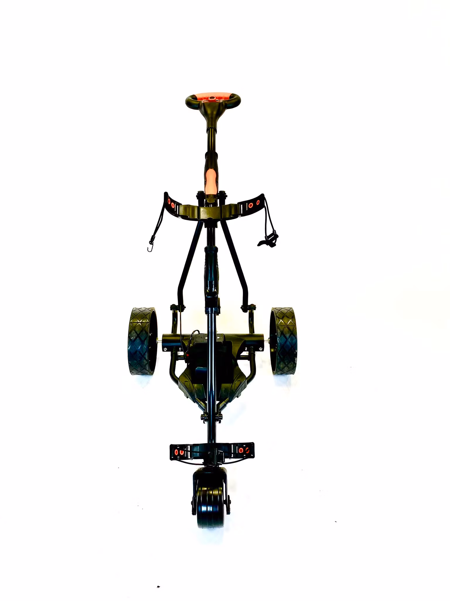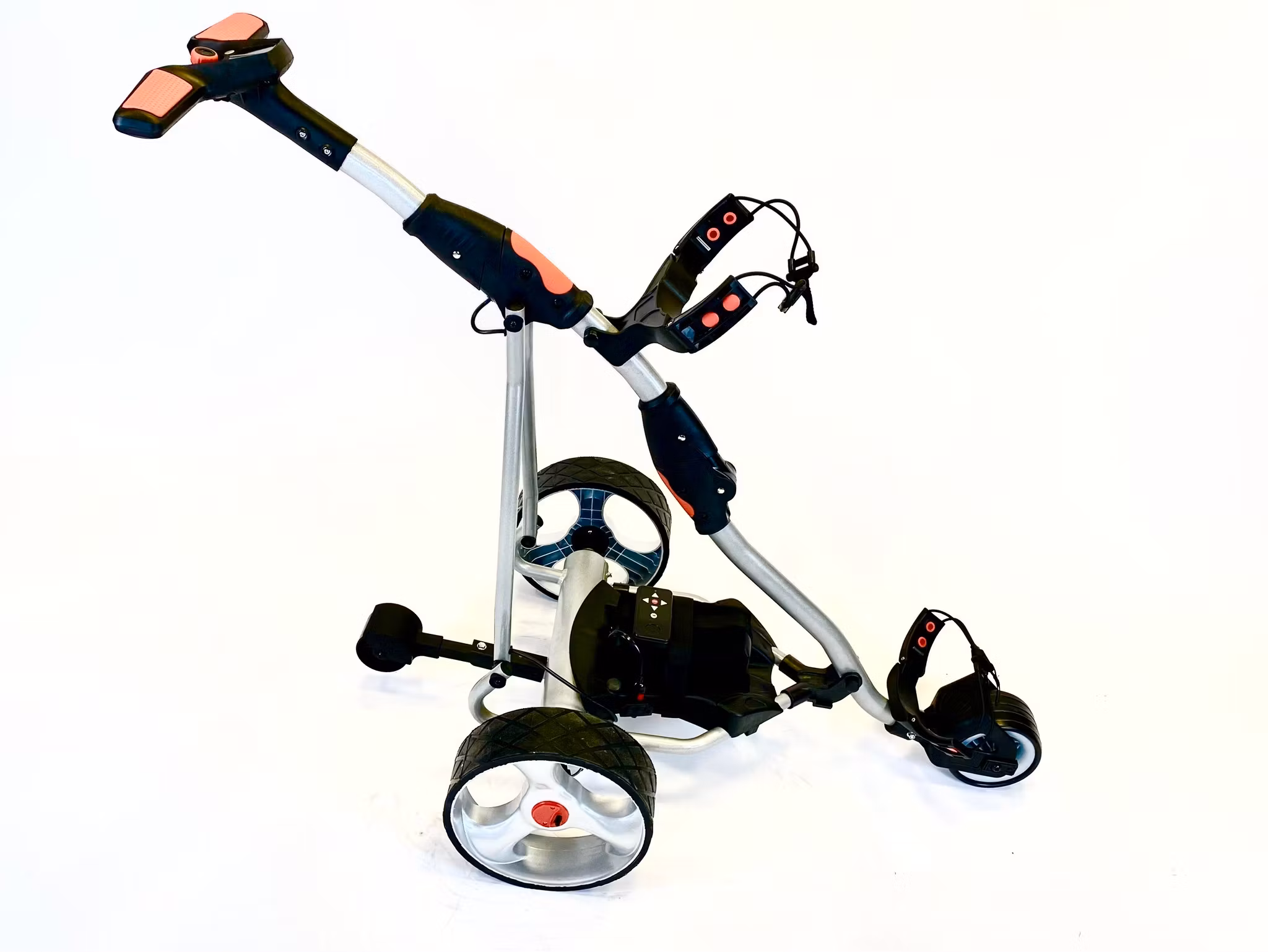En separat batteriväska medföljer, som gör att du enkelt kan lyfta ur batteriet, till exempel för laddning. Den elektriska golfvagnen har gummihjul vilka är lågprofil, underhållsfria gummibeklädda hjul som lätt tar sig runt på golfbanan.