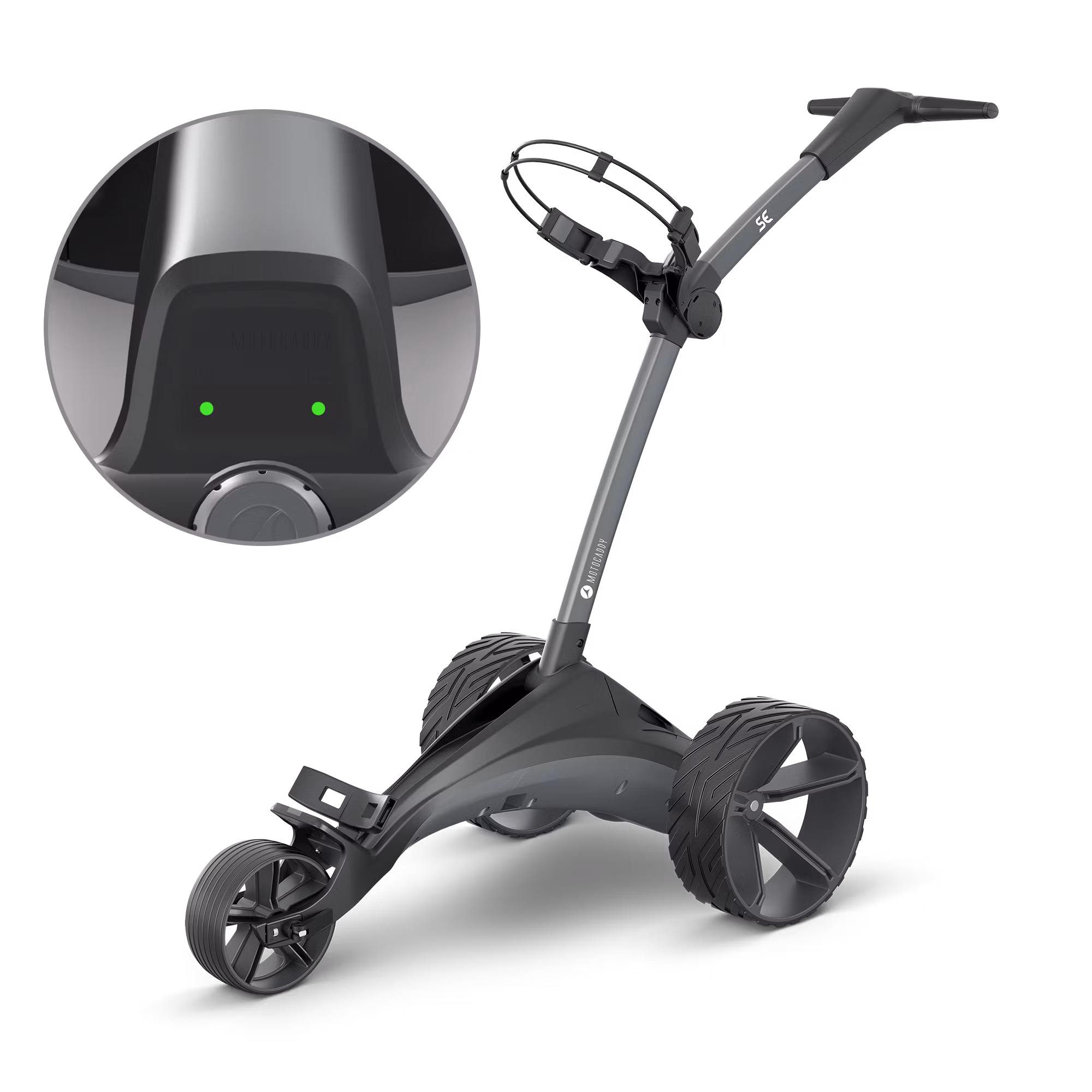 SE levererar pålitlig Motocaddy-design, prestanda och tillförlitlighet med enastående värde, har en elegant bilinspirerad styling och drivs av ett nytt lätt men kraftfullt CLICK 'N' CONNECT®-litiumbatteri utan kabel. Detta innovativa batterisystem inkluderar patenterad automatisk frånkopplingsteknik som automatiskt stänger av vagnen när den fälls ihop, tillsammans med en praktisk popup-laddningsport för enkel laddning ombord.