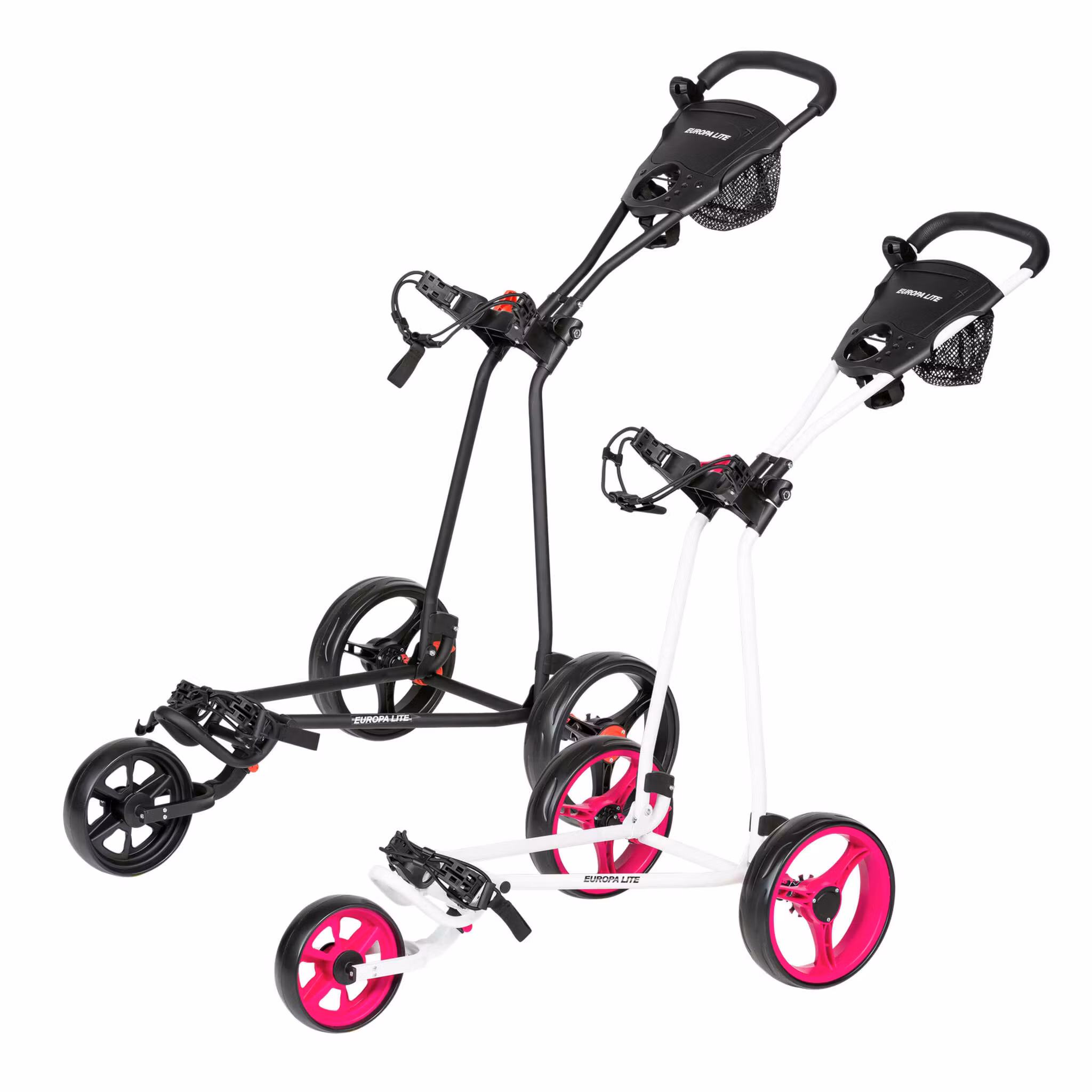 Europa Lite är en stabil och tålig manuell golfvagn. En rak axel mellan bakhjulen tillsammans med en bredbent hals gör att vagnen känns otroligt stabil att köra Fotbroms och scorekorthållare ingår. Bagen säkras på golfvagnen med bungee-remmar.