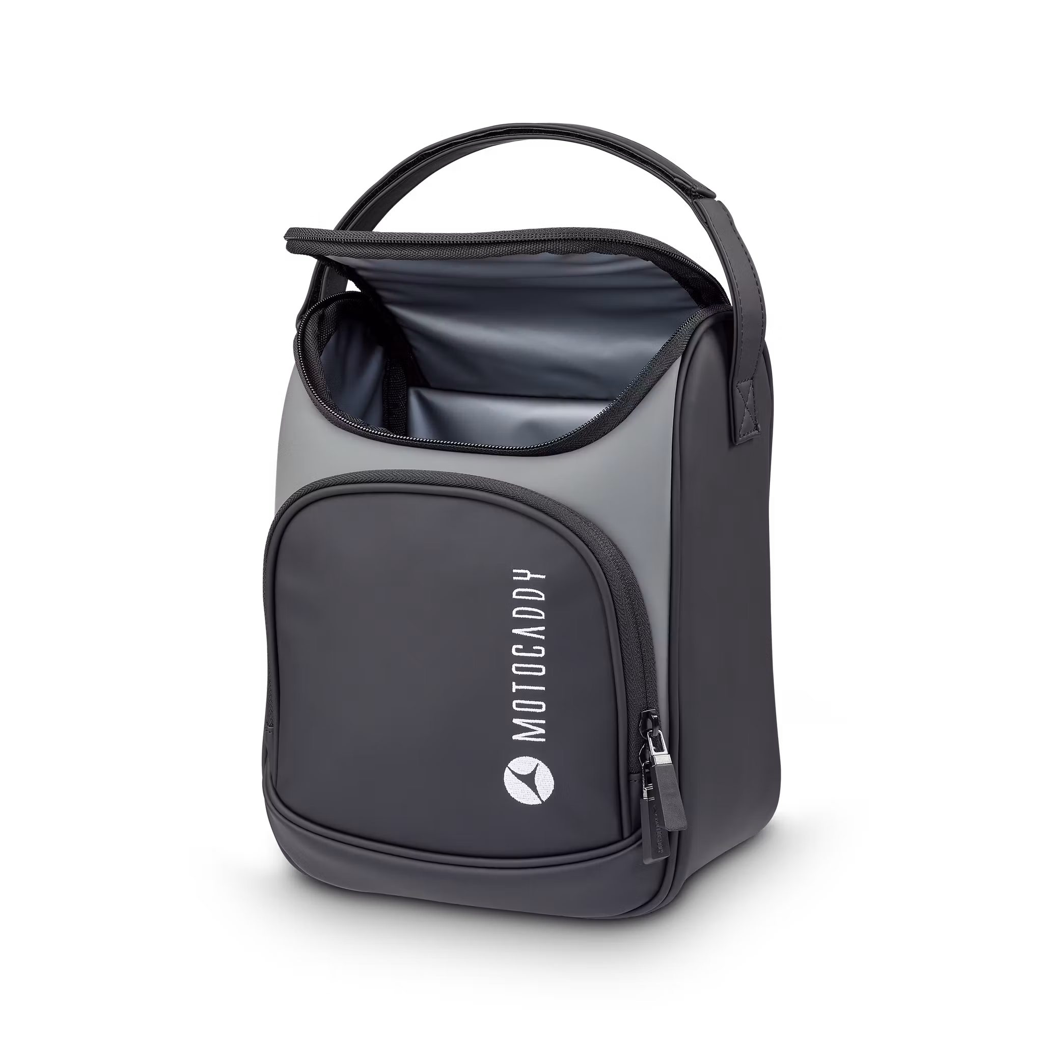 Väskan har ett bärhandtag ovanpå och fästs på golfvagnen