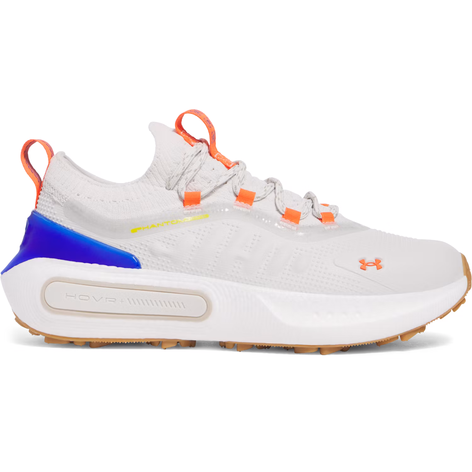 UA Phantom Fore Moving Day Ovandel: 60 % syntet, 40 % textil Yttersula: 100 % gummi Mjuk och strukturerad TPU-beläggning med stickad krage och plös för en strumpliknande passform och exceptionell komfort. Lätt vattentätt membran och NeverWet-behandlat stickat material håller dig sval och torr på fuktiga dagar. Elegant TPU-hälförstärkning och häldragflik för enkel på- och avtagning. UA HOVR+ dämpning ger extra fjädring, minskar stötar, återvinner energi och hjälper dig framåt. Hållbar gummiyttersula med rotationsresistent greppmönster.