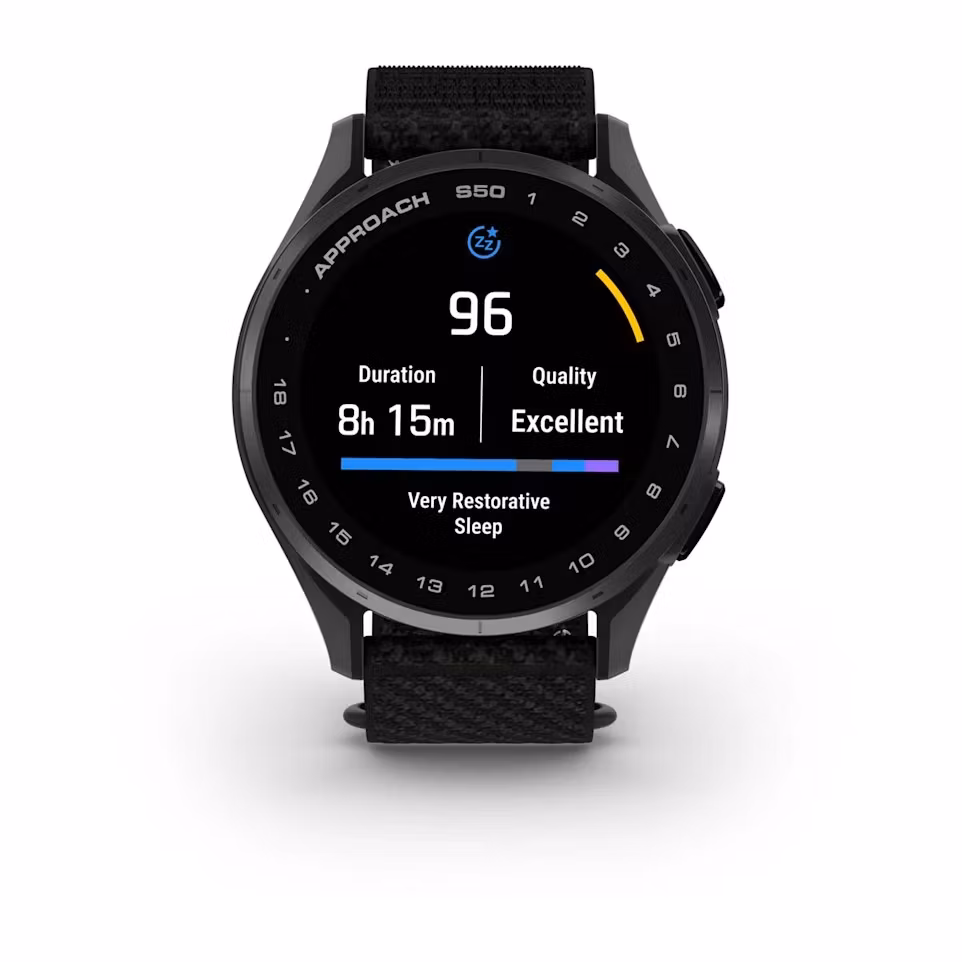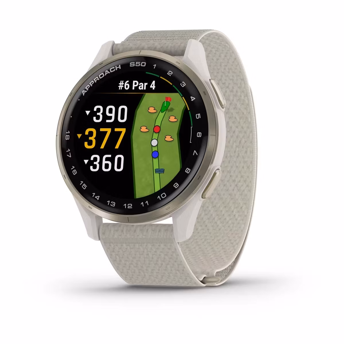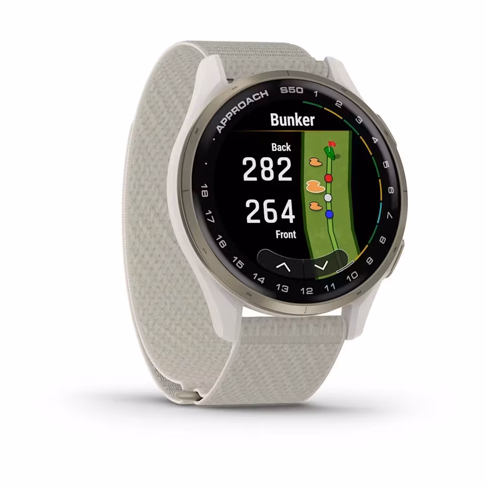 We’ve got your game. Approach® S50 är golfklockan med GPS som har allt du behöver, både på och utanför banan. Den har en tunn och lätt konstruktion och ComfortFit nylonarmband så den kan enkelt bäras hela dagen. Med den ljusstarka AMOLED-skärmen kan du enkelt se viktiga avstånd till greenen, hinder och doglegs på fler än 43000 förinlästa banor över hela världen. Få PlaysLike-avstånd för varje slag med justerade avstånd för höjdförändringar, och även om du inte kan se greenen vet du alltid var den finns med PinPointer. När du har lämnat banan kan du hålla koll på din hälsa med aktivitetsprofiler för styrka, yoga och löpning.