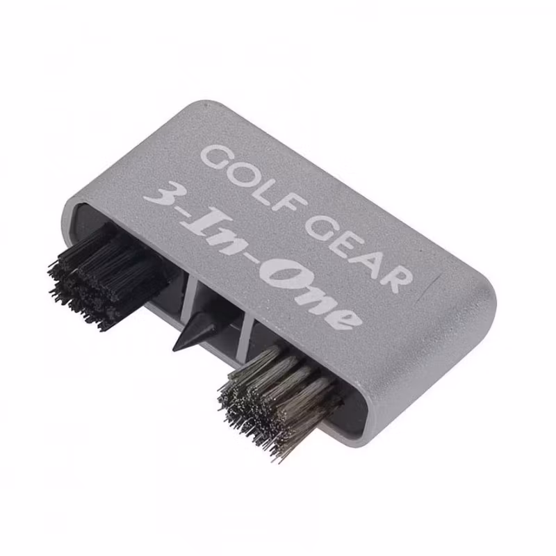 3 In 1 Club Cleaner - En kompakt borste med flera funktioner. Mässingsborste för rengöring av järnklubbor, nylonborste för metalwoods, spets att peta bort smuts